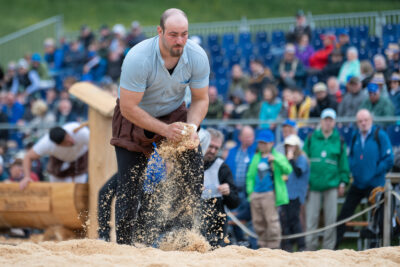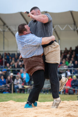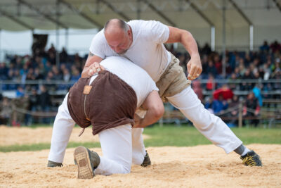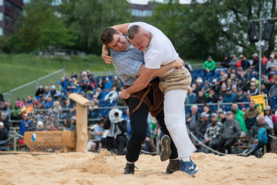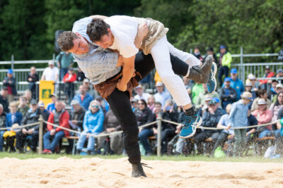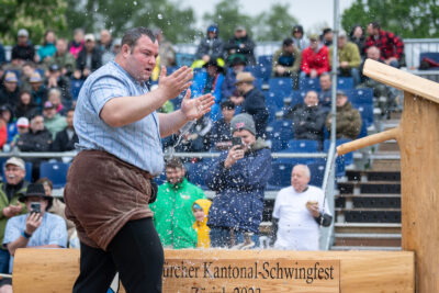 Leider spielte das Wetter nicht ganz mit. Immer wieder zogen Regenschauer über den Festplatz und die Zuschauer verschwanden wieder unter Ihren Regenpellerinen. Domenic Schneider störte das nicht, im Gegenteil. Im ersten Spitzengang gegen den 150 kg Koloss Samir Leuppi (Winterthur) machte Dodo kurzen Prozess und gewann mit der Maximalnote 10. Danach wurde er nur noch von Christian Bernold (Berschis) ausgebremst. Der Gang endete gestellt. Die anderen Gegner besiegte Domenic allesamt. Auch Schlussganggegner Shane Dändliker (Feldbach) konnte der enormen Power von Dodo nicht lange standhalten. Somit gewann Domenic Schneider bereits sein zweites Kranzfest in der noch jungen Saison 2023.