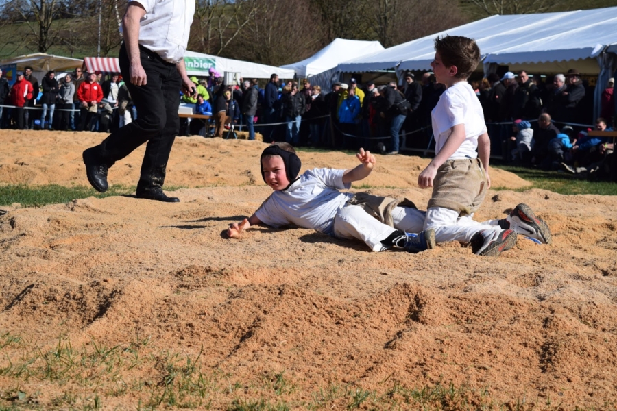 Bei den jüngsten durfte Yannick Siegenthaler auf Rang 1c seinen ersten Zinnbecher abholen. Er musste sich einzig im ersten Gang das Sägemehl vom Rücken abwischen lassen. Danach gewann er alle Gänge klar gegen seine Gegner.