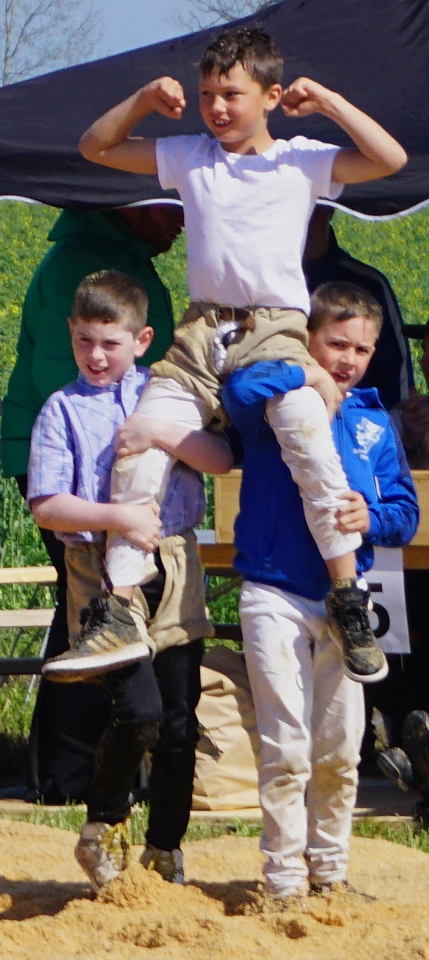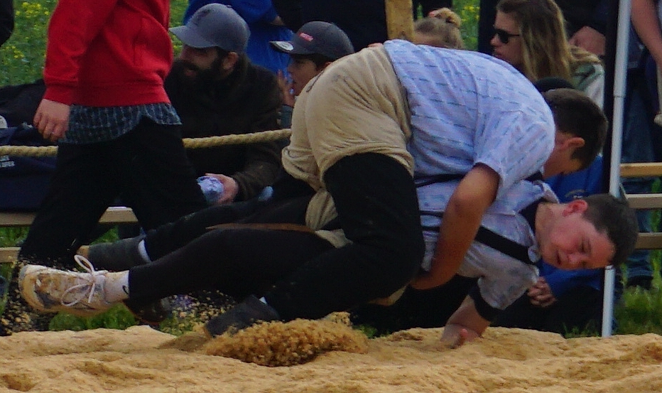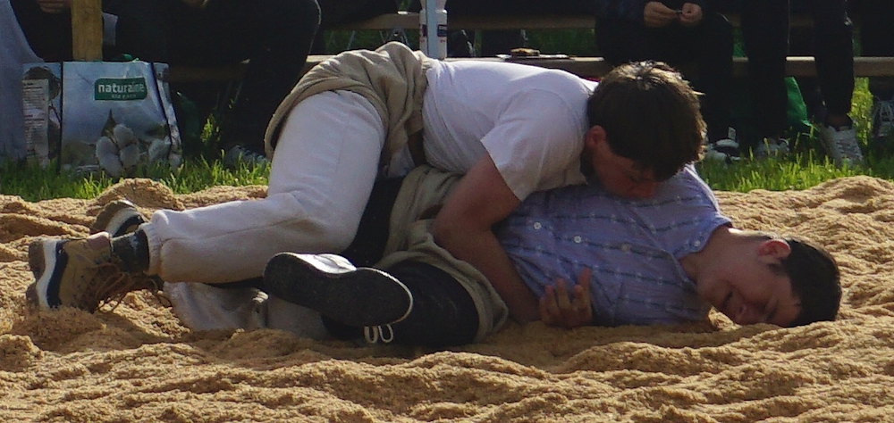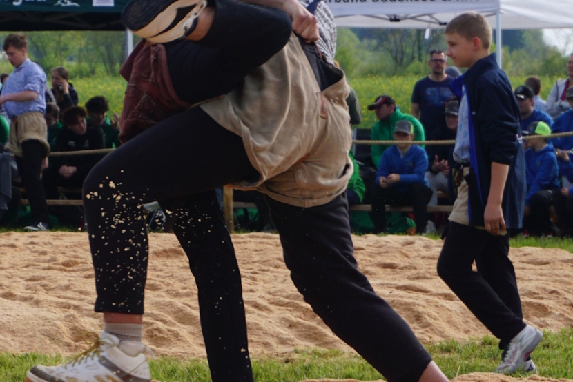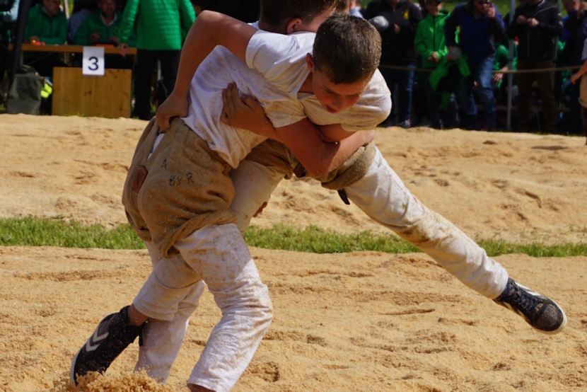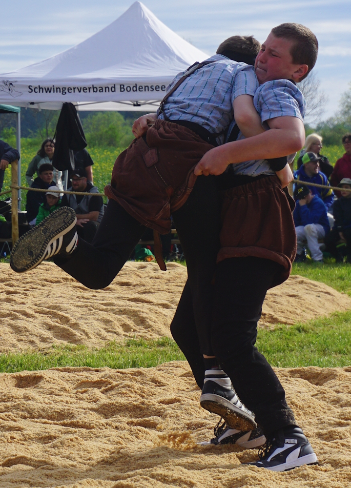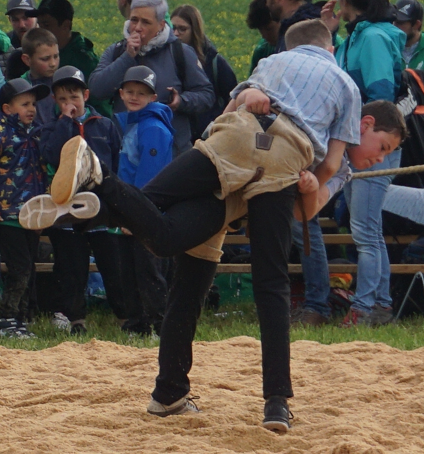 Rafael Gamper (2014) aus Romanshorn liess keinen Zweifel an seiner tollen Form aufkommen. Mit fünf souverän gewonnenen Gängen qualifizierte er sich für den Schlussgang. Dort traf auch er auf einen Team-Kollegen, Diyar Yildiz (2013) – ebenfalls aus Romanshorn. Beide griffen von Sekunde 1 an mit ihren Paradeschwüngen an und wollten den Gang bestimmen. Mit einem wuchtigen Lätz konnte Diyar seinen Gegner zu Boden bringen. Nach kurzer Bodenarbeit gewann Diyar den Schlussgang der Romanshorner. Oder heisst es Romanshörner? Aufgrund Rafaels grossem Punktevorsprung änderte Diyars Sieg aber nichts an der Schlussrangliste. Rafael gewann das Fest gefolgt von Diyar auf Platz 2. Damian Hungerbühler (2013) aus Amriswil und dem Steinebrunner Kevin Stadelmann (2014) gelangen an diesem Tag das gleiche Kunststück. Beide verloren keinen Gang und klassierten sich mit drei gewonnenen und drei gestellten Gängen auf den Rängen 8 resp. 9. Auch der Egnacher Andrin Müller (2014) sicherte sich mit drei Siegen die nächste Auszeichnung.