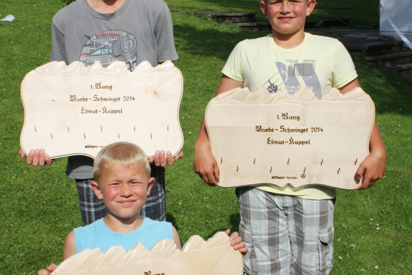 Bei den jüngsten zeigten sich die Thurgauer von der sehr guten Seite. Unter den ersten fünf platzierten findet man fünf Thurgauer Jungschwinger. Den Schlussgang machten die beiden Clubkollegen Andrin Habegger, Tägerschen und Kilian Kolb, Affeltrangen unter sich aus. Die beiden kannten sich gut und kämpften um den Sieg. Am Schluss gelang Kolb mit einem Kurz und nachdrücken am Boden den Sieg über Habegger. Beim Jahrgang 03/04 zog This Kolb, Affeltrangen mit einem halben Punkt Vorsprung in den Schlussgang. Sein Gegner aus dem Toggenburg Marco Forrer, Stein musste somit voll auf Angriff schwingen wollte er gewinnen. Ein spannender Zweikampf mit vielen Aktionen. Nach acht Minuten endet der Gang gestellt und This Kolb gewann das Schwingfest mit seinem Vorsprung.