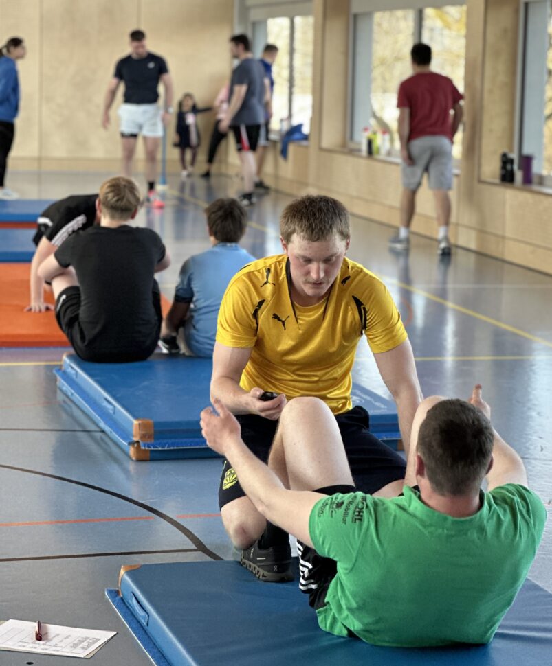 Die eine Gruppe widmete sich danach einer intensiven Einheit im Athletik-Training in der Turnhalle, während die anderen sich im Sägemehl der Schwing-Technik widmeten. Nach der Pause wurden die Einheiten gewechselt.