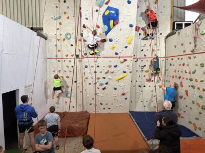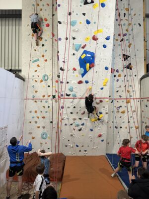 Nach dem Mittag durfte eine Gruppe in die Bodan-Kletterhalle verschieben. Dort wurden sie von einem versierten Kletterer eingeführt und geschult. Schon bald hing die halbe Truppe in der Wand, während die andere Hälfte unten sicherte. Ziel war Teambildung, Koordination und Kraft. Selbstverständlich kam dann bei dem einen oder anderen der Ehrgeiz zum Vorschein, es bis ganz nach oben zu schaffen. Überhängend?