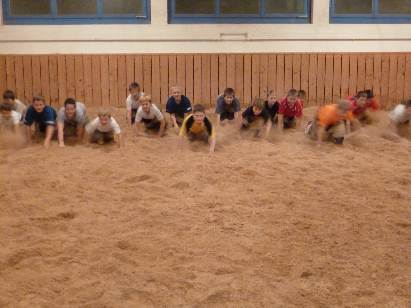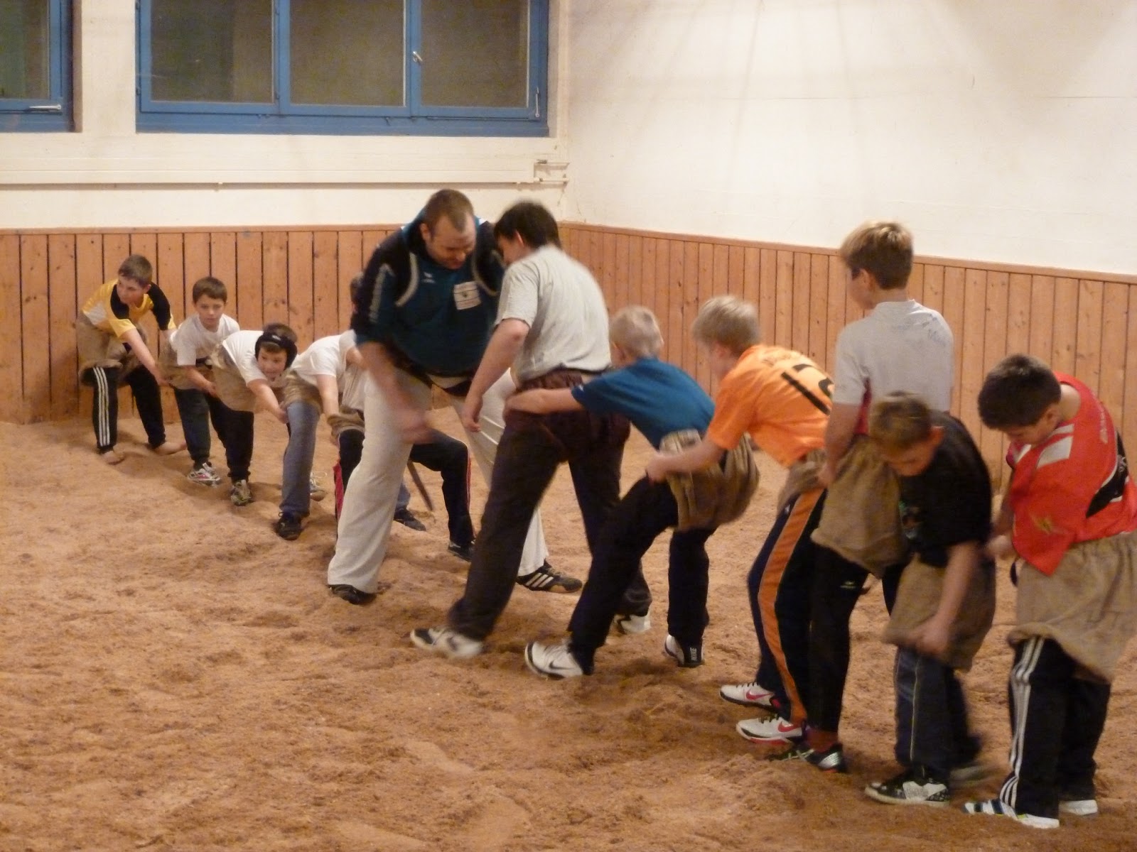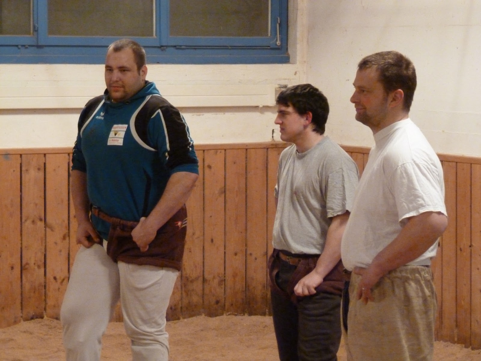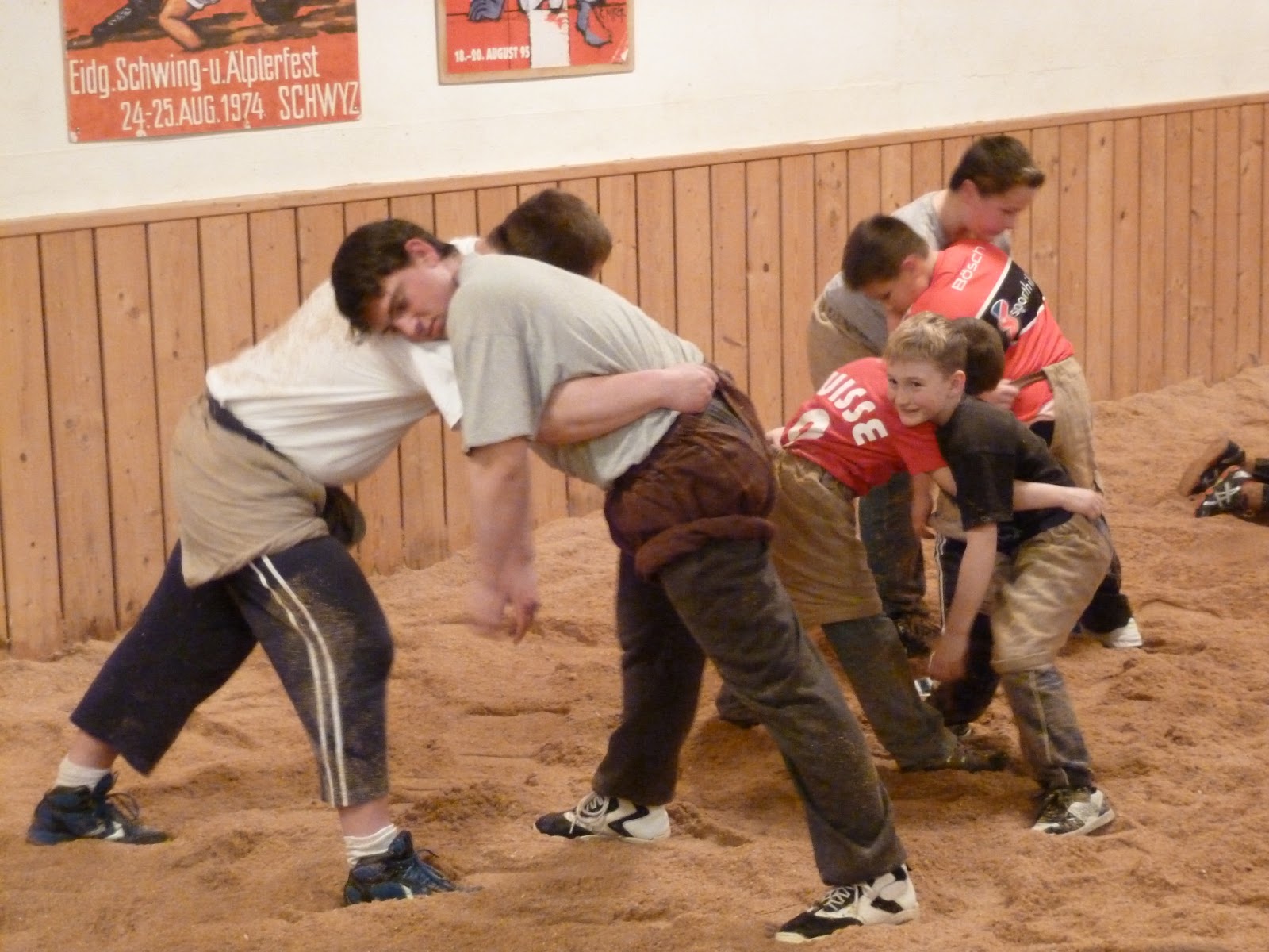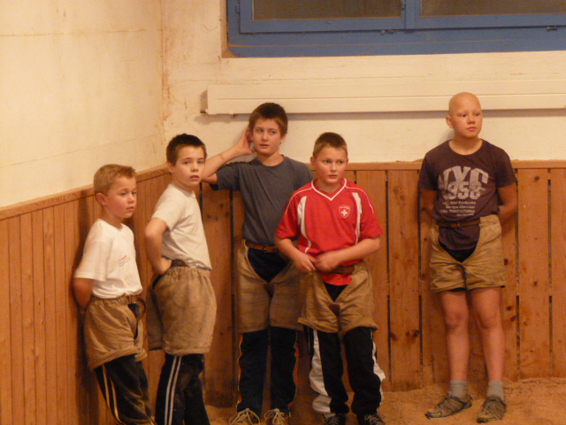 Er erklärte Ihnen, dass die Schwinger sich zuerst begrüssen, dann greifen und am Schluss der Gewinner dem Verlierer das Sägemehl vom Rücken wischt. Und dann ging es los. Nach dem die Schnupperschwinger ein paar Schwünge unter sich machten, durften sie mit den bereits aktiven Jungschwinger zusammengreifen. Die Schnupperschwinger machten an diesem Abend zum ersten mal Bekanntschaft mit dem Sägemehl und den Zwilchhosen. Sie waren nach dem Training begeistert und auch ziemlich erledigt vom Kräftemessen mit den „Bösen“.